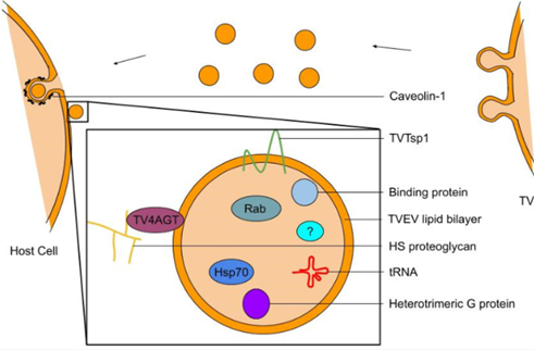 Figure 1: Cargo of T. vaginalis Extracellular Vesicles (TVEVs). TV secretes EVs through caveolin dependent endocytosis, which increases pro-inflammatory cytokine levels, enhances TV adherence, and degrades epithelial junctions.